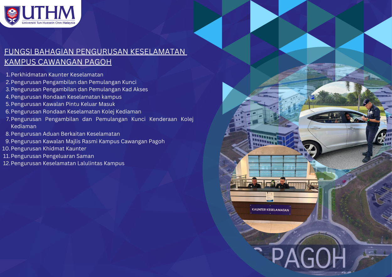 Ketua Bahagian Pengurusan Keselamatan Kampus Pagoh: En. Mohamad Firdaus bin Nasir. No. Tel: 06 974 2004